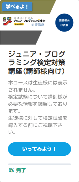 本コースを生徒様に受講して頂く前に、講師様用コースとして、「ジュニアプログラミング検定対策コース(講師編)」ご視聴されることを推奨いたします。