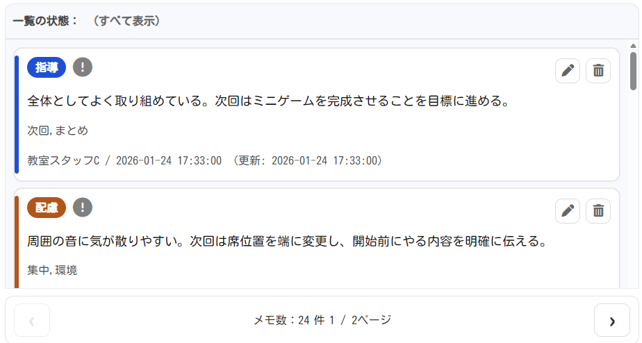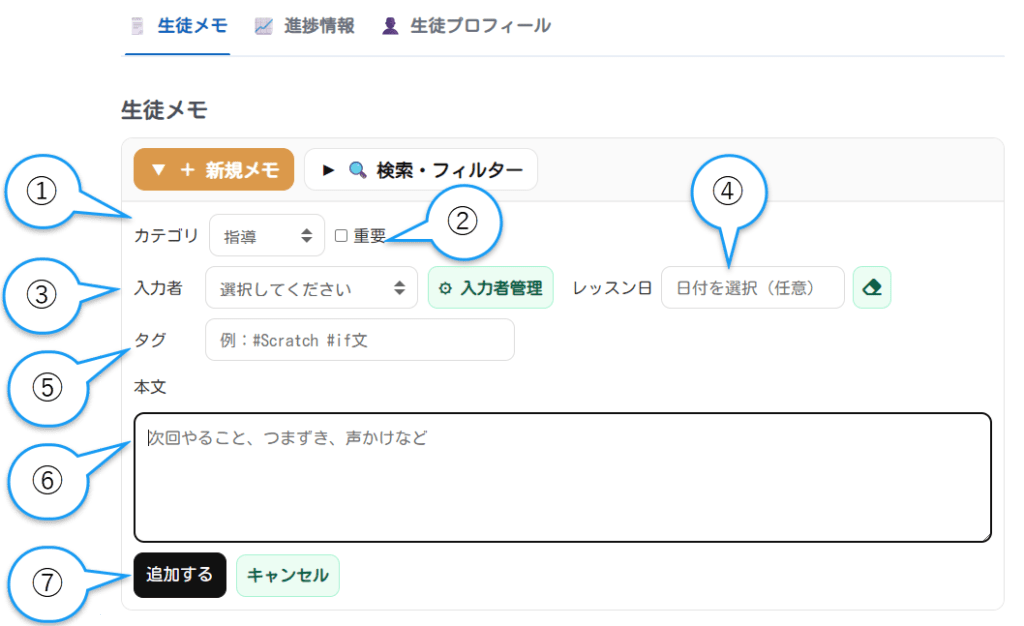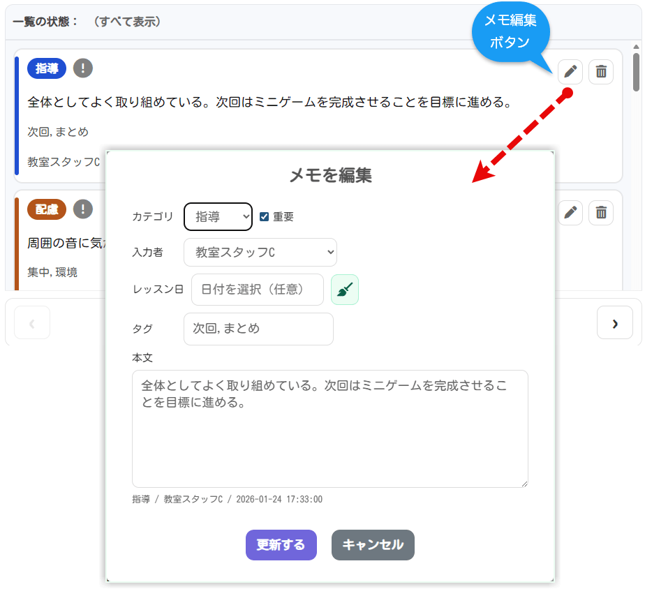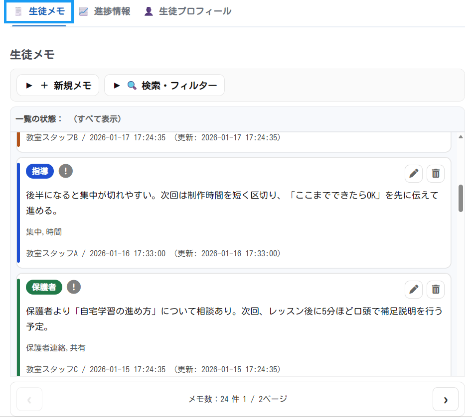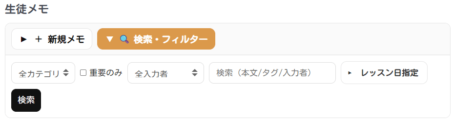 メモは、カテゴリ・重要・入力者・レッスン日・タグ・本文といった項目を持ち、検索や絞り込み、編集・削除が可能です。