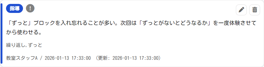 - カテゴリ:全カテゴリ / 指導 / 事務 / 保護者 / 配慮