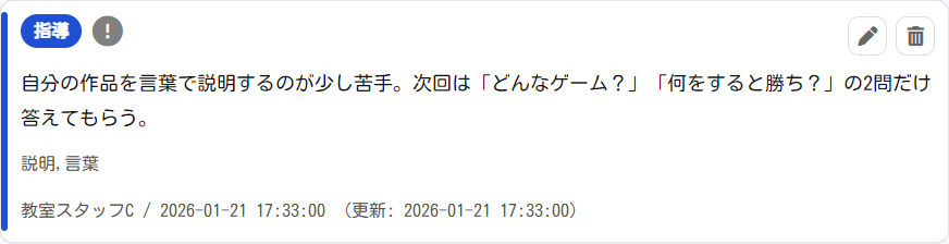 生徒の理解が進んだ、反応が良かった声かけや説明の仕方を残します。