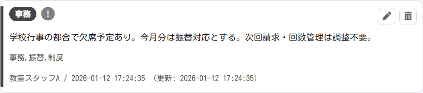 運営や事務に関わる判断や対応の記録も、生徒ごとにまとめて残すことができます。