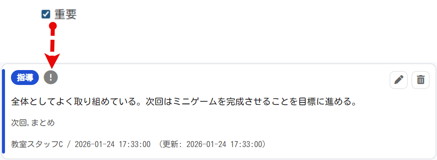 重要メモにチェックすると、一覧で目立ちやすく表示され、並び順でも上位に来やすくなります。