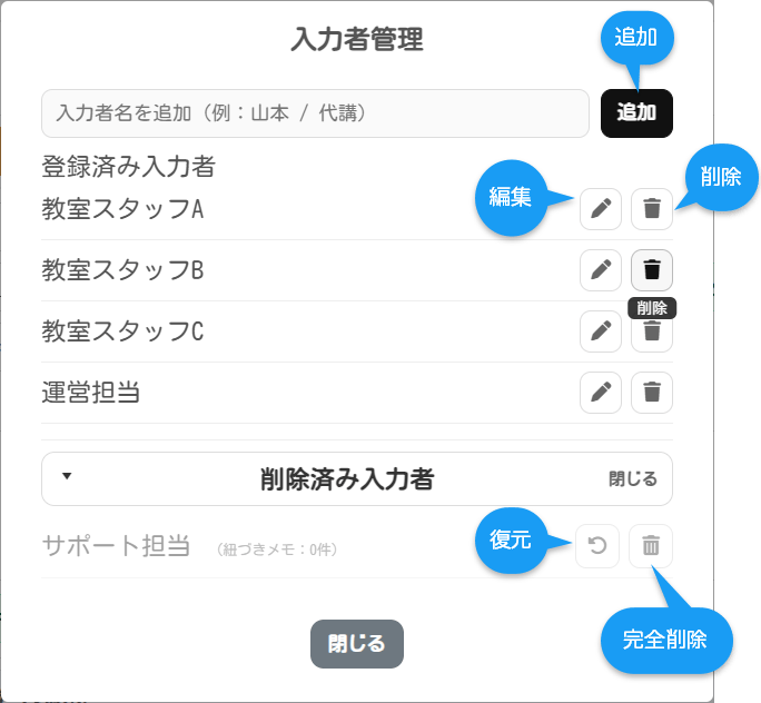 「 入力者管理」から、入力者の追加・編集・削除(復元/完全削除)ができます。