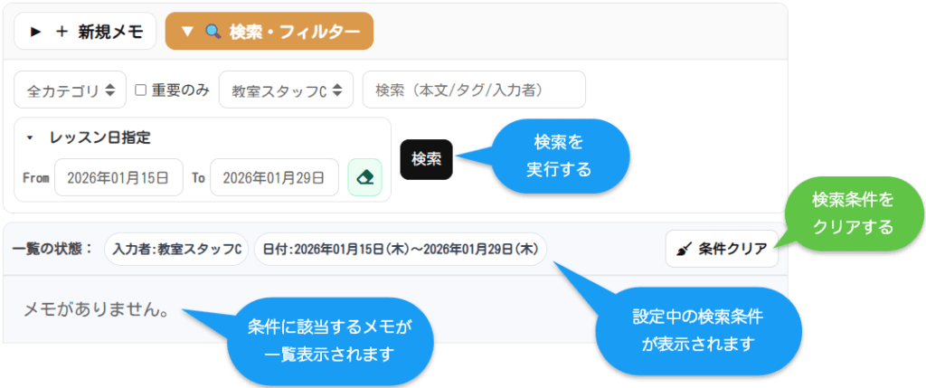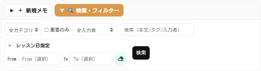 - レッスン日指定(From〜Toの範囲。片側だけ指定もOK。入力ミスでFrom>Toになった場合は自動で入れ替わります)
